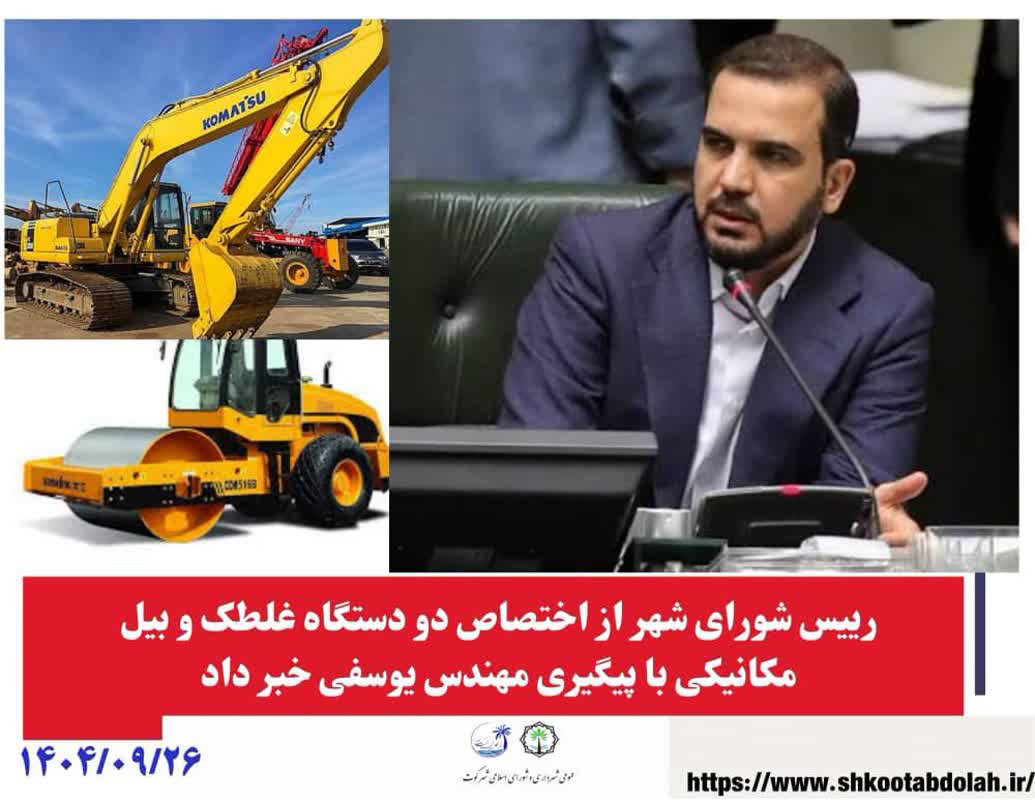 *رییس شورای شهر کوت عبدالله با اشاره به اهمیت تأمین ماشینآلات عمرانی مورد نیاز شهرداری گفت: تکمیل ناوگان موتوری نقش مهمی در افزایش سرعت اجرای پروژههای عمرانی، بهبود خدمات شهری و ارتقای رضایتمندی شهروندان دارد و اضافه شدن این تجهیزات گام مؤثری در این مسیر است.*