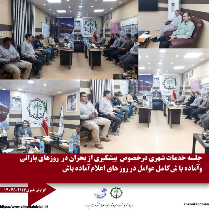 *جلسه هماهنگی و برنامهریزی خدمات شهری با محوریت پیشگیری از بحران در روزهای بارانی و آمادهباش کامل نیروها صبح امروز به ریاست دکتر عبیاوی، شهردار برگزار شد.**در این جلسه، تمامی مدیران واحدهای تخصصی، عوامل اجرایی و مسئولان نواحی شهری حضور داشتند.**در این نشست، بر آمادگی ۱۰۰ درصدی نیروهای خدمات شهری و فضای سبز در قالب شیفتهای منظم عملیاتی تأکید شد.**همچنین مقرر گردید تمامی نیروهای حاضر در عملیات بارندگی به لباسهای بارانی، چکمه، چراغ قوه، تجهیزات امدادی و ابزار تخصصی مورد نیاز مجهز شوند.**شهردار در این جلسه ضمن اشاره به ضرورت مدیریت پیشگیرانه، اعلام کرد: «با توجه به اعلام آمادهباش در روزهای بارانی، همه نیروها باید در آمادهباش کامل بوده و مسیرهای آبرو، کانالها و نقاط حادثهخیز بهصورت مستمر پایش و پاکسازی شوند.»**در پایان، هماهنگی میان واحدهای مختلف برای اجرای سریع و مؤثر عملیات، از جمله لایروبی جویها، رفع انسدادها، جمعآوری زبالههای احتمالی سدکننده مسیر آب، و رسیدگی به درختان معارض مورد تأکید قرار گرفت.*