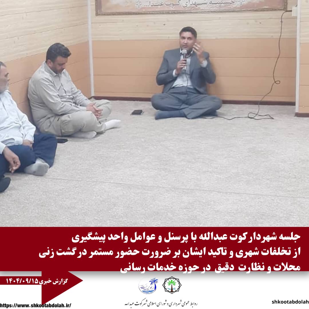 به گزارش روابط عمومی شهرداری و شورای اسلامی شهر کوت عبدالله امروز جلسهای با حضور شهردار، مدیران شهری و نیروهای واحد اجراییات و پیشگیری از تخلفات شهری در نمازخانه شهرداری برگزار شد.